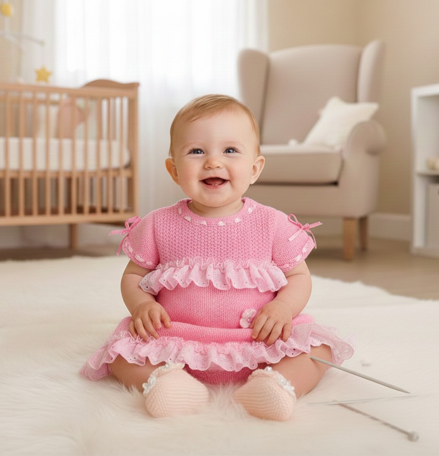 This is a very simple knit for people new to using knit in lace. I used the lace with broderie anglaise attached and added ribbon and flowers. Personally I think this is suitable for a beginner as the stitch is straight forward knit and purl and it is the lace that really brings it to life. Pictures do not do this design justice and you can really make it your own with whatever embellishments you add.